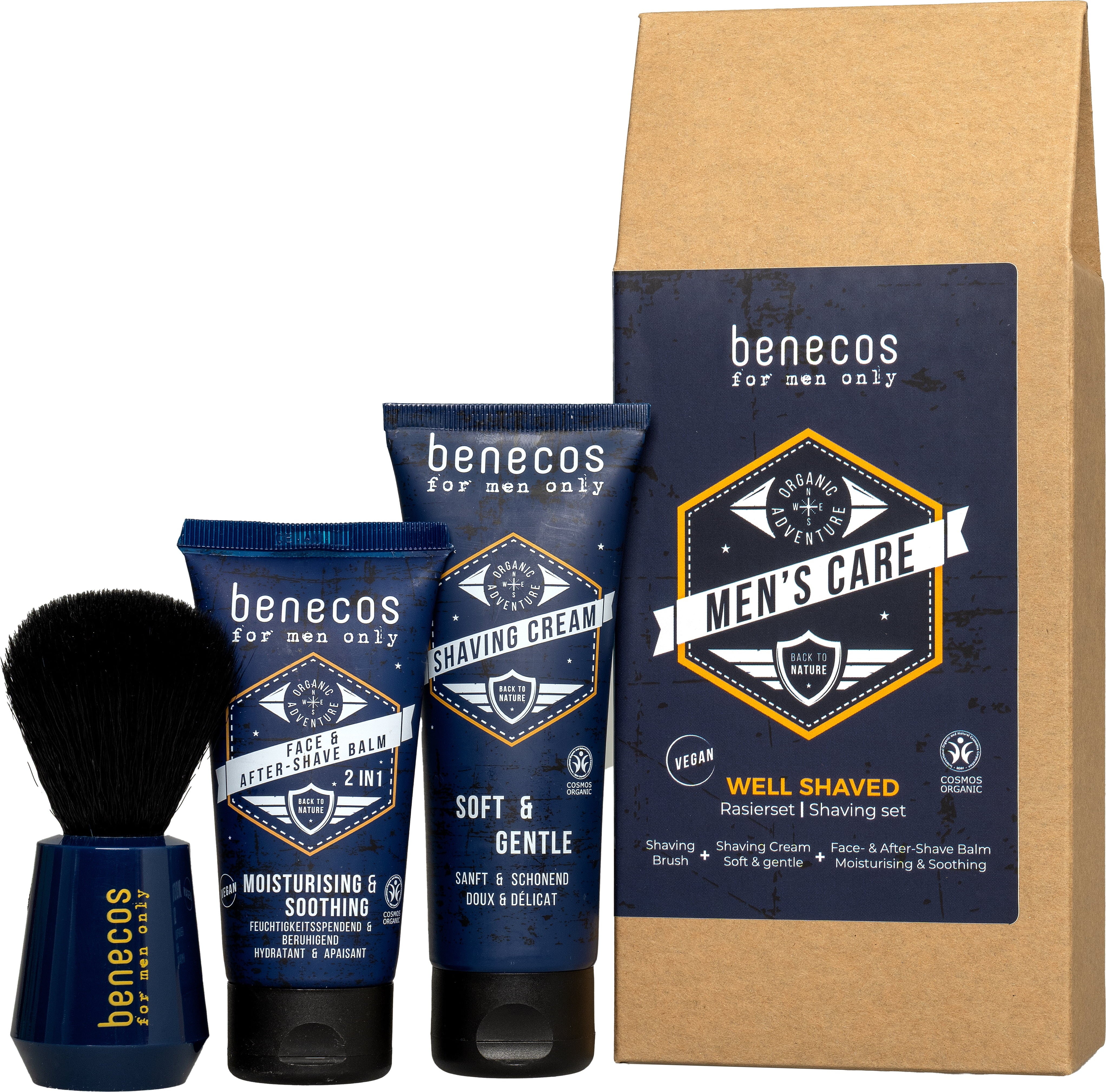 Tato dárková sada obsahuje perfektní trio produktů na holení – ihned k darování! Holicí krém se optimálně napění veganským štětcem, což umožní hladké klouzání břitu. Balzám po holení dodá potřebnou hydrataci.