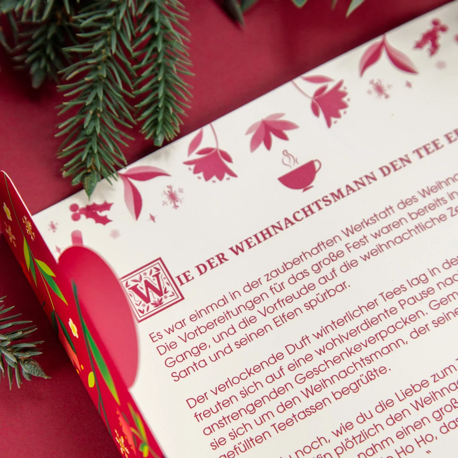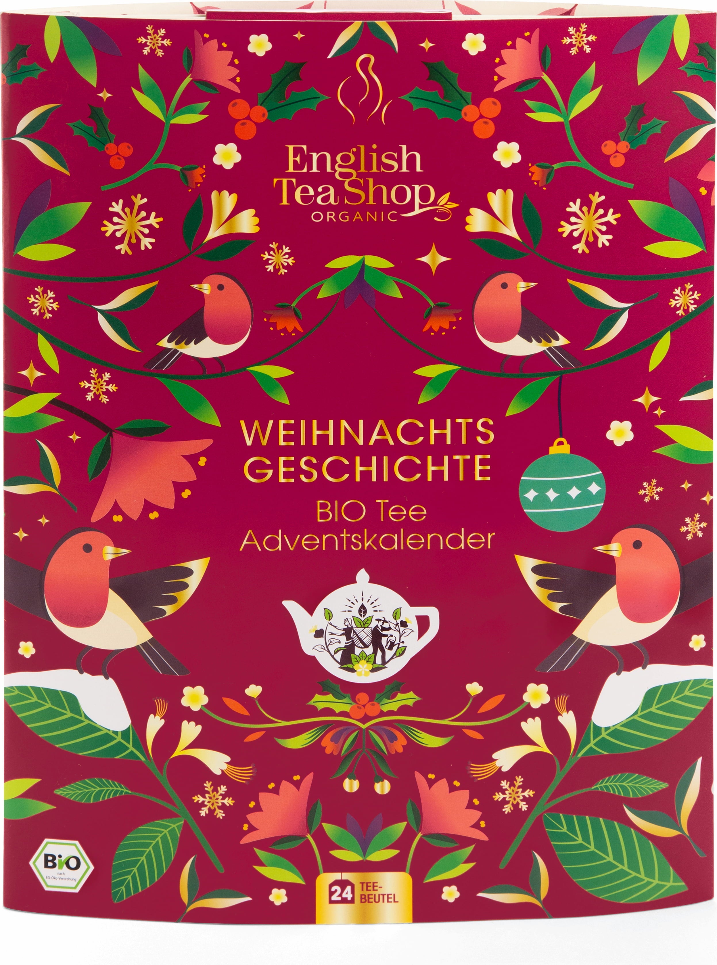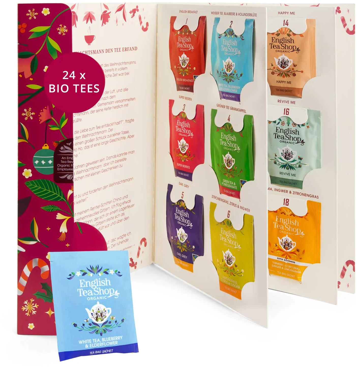 Tento jedinečný adventní kalendář lze listovat jako knihu a na několika stranách ukrývá 24 bio čajů. Nechybějí mezi nimi ani exkluzivní zimní a vánoční čaje, které doprovází poutavý vánoční příběh k předčítání i samostatnému čtení (v němčině) a další překvapení. Je ideální pro všechny milovníky čaje i pro každého, kdo si chce během adventu dopřát chvíle požitku a odpočinku.