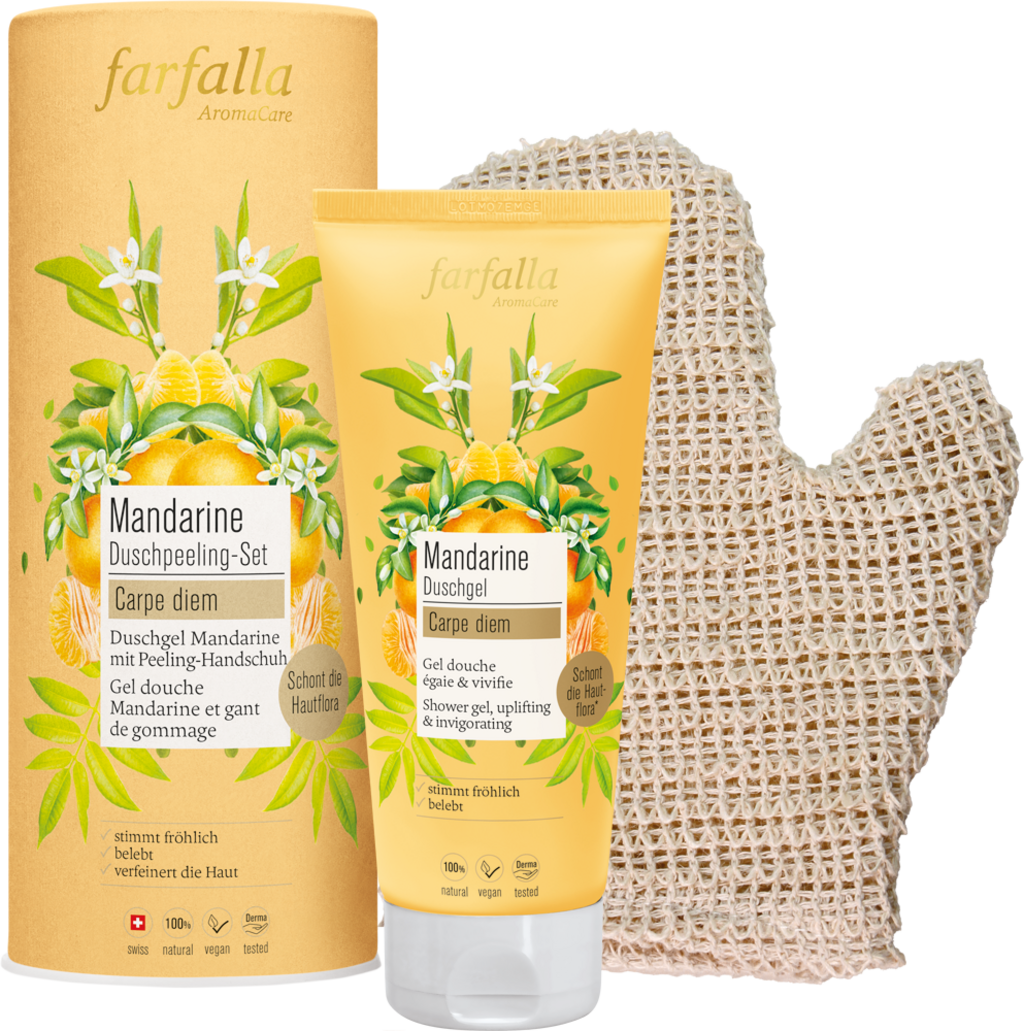 Tato sada od značky farfalla spojuje jemnou péči s přirozenou vitalitou a dodá Vám energii do nového dne. Hlavní roli hraje sprchový gel s mandarinkou, který oslní svěží vůní a esenciálním olejem z mandarinky s povzbuzujícím účinkem. Peelingová rukavice ze 100% bavlny a juty promění Vaše sprchování v kompletní zážitek: jemnými krouživými pohyby odstraní odumřelé kožní buňky a zanechá pokožku krásně hladkou a hebkou.