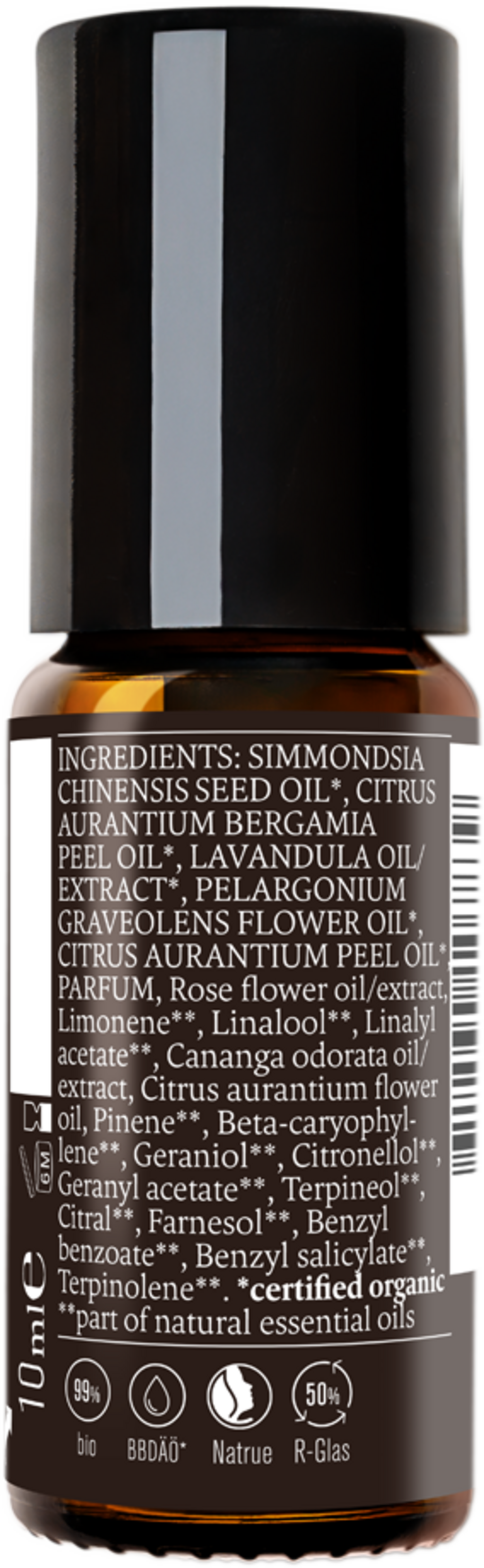 Simmondsia Chinensis (Jojoba) Seed Oil[1], Citrus Bergamia Peel Oil[1], Lavandula Oil/Extract[1], Pelargonium Graveolons (Geranium) Flower Oil, Citrus Aurantium Peel Oil, Parfum, Rose Flower Oil/Extract, Limonene[2], Linalool[2], Linalyl Acetate[2], Cananga Odorata (Ylang Ylang) Oil, Citrus Aurantium Amara (Bitter Orange) Flower Oil, Pinene[2], Beta-Caryophyllene[2], Geraniol[2], Citronellol[2], Geranyl Acetate[2], Terpineol[2], Citral[2], Farnesol[2], Benzylbenzoat[2], Benzyl Salicylate[2], Terpinolene[2]