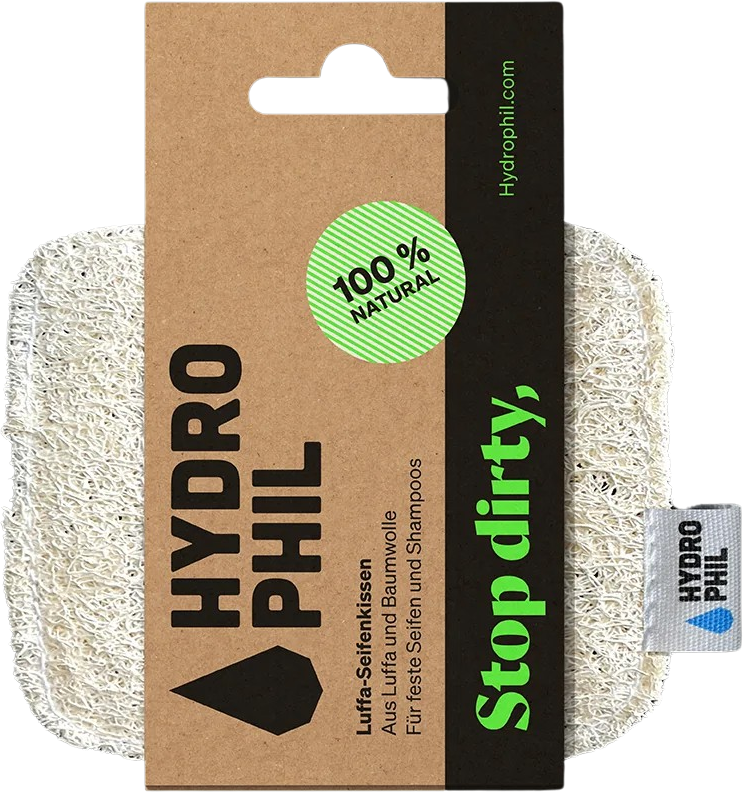 Mýdlový polštářek z luffy od společnosti Hydrophil se vyrábí ručně, ve Španělsku. Díky optimální savosti materiálu navíc mýdla rychle schnou. Voda a zbytky jednoduše stékají skrz propustný materiál.