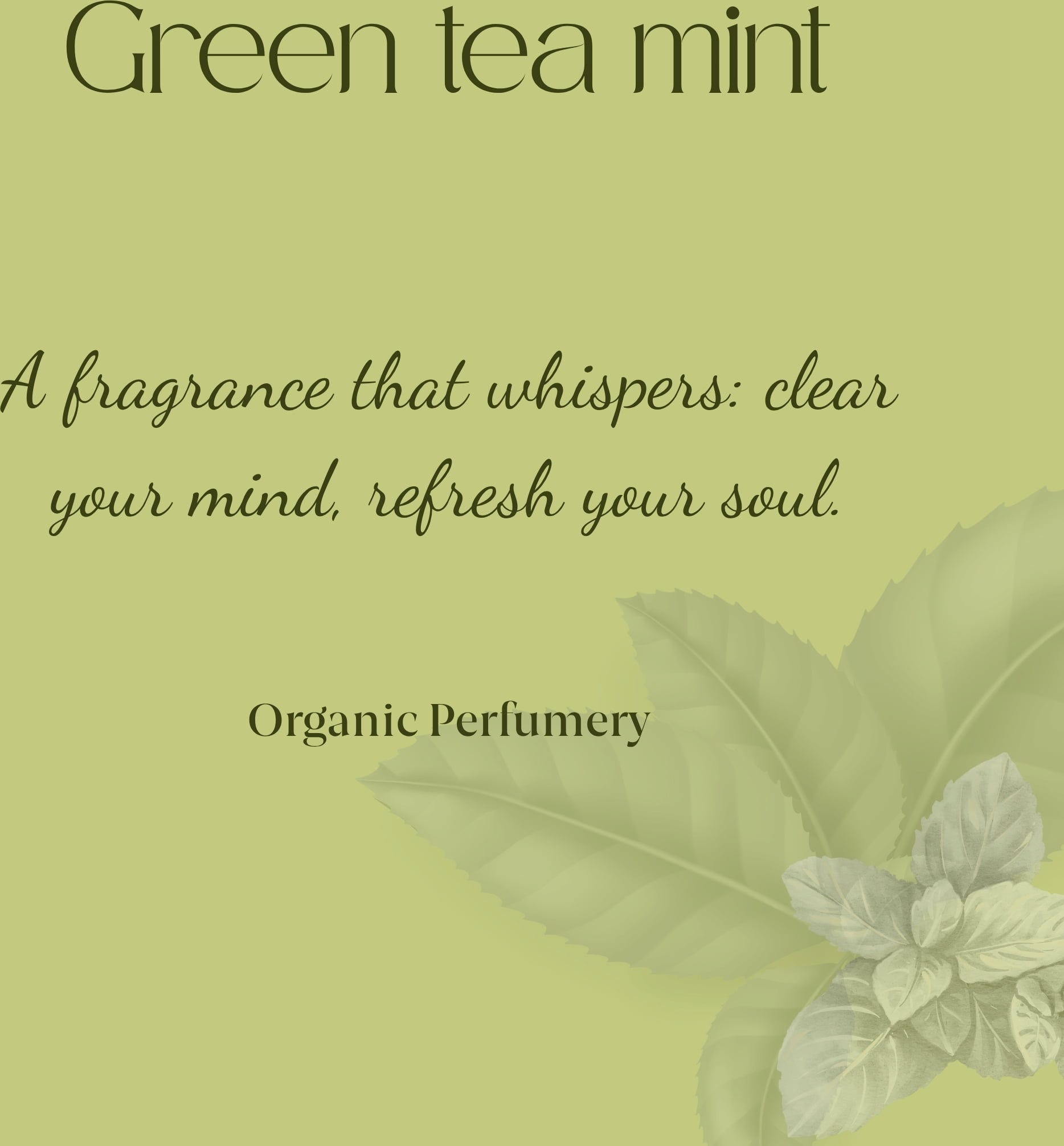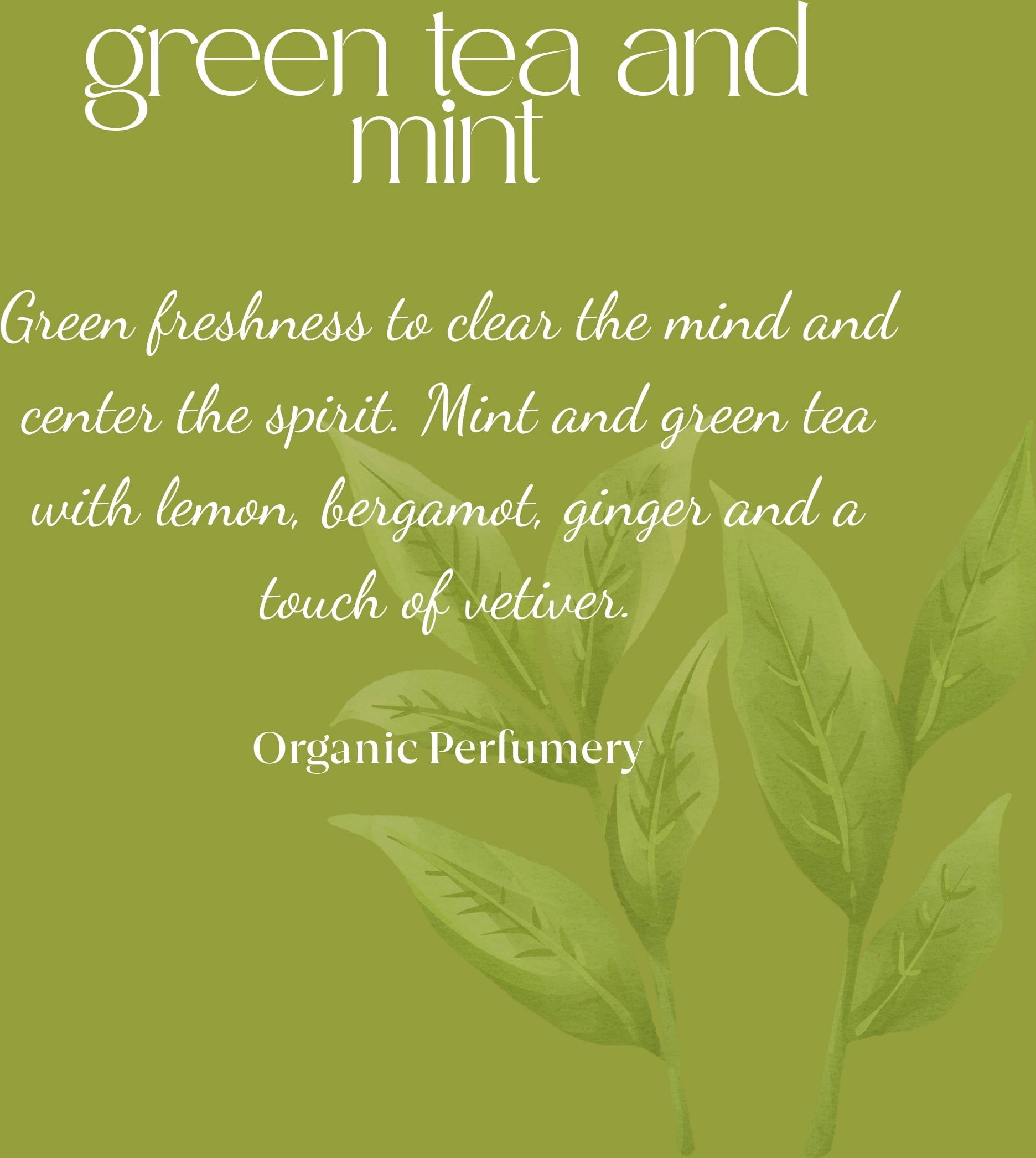 Povzbuzující vůně Tea & Mint Organic Fresh Fragrance připomíná svěžest zeleného čaje v kombinaci se šťavnatou mátou. Je ideální pro všechny, kteří si potrpí na stimulující a energii dodávající vůně. Toto ručně vyráběné parfémované dílo bylo macerováno s bio mátou, která mu propůjčuje ještě přirozenější charakter.