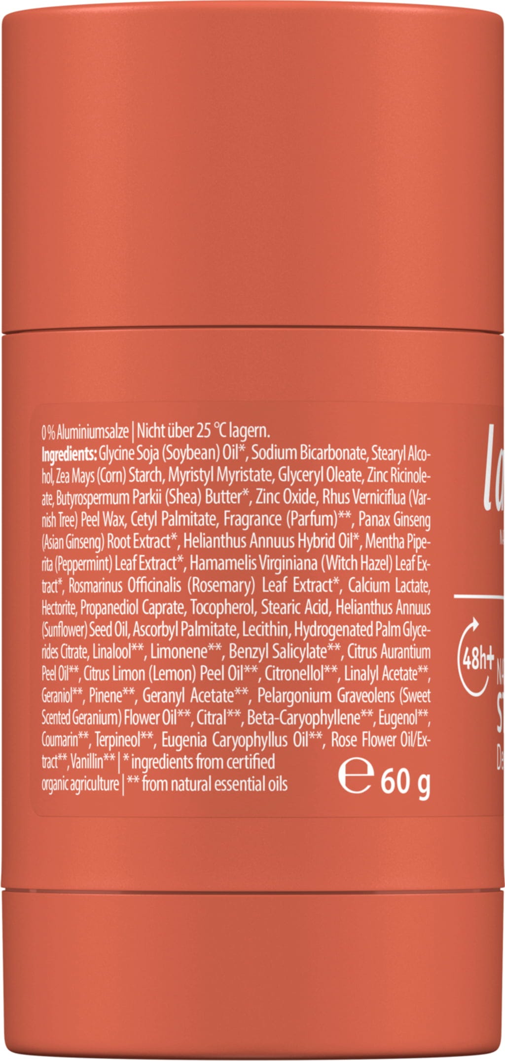 Kombinace aktivních látek s bio ženšenem a přírodními minerály přirozeně a účinně chrání před vznikem nepříjemného zápachu a zajišťuje dlouhotrvající pocit svěžesti. Díky jemnému složení s bambuckým máslem lze deodorant používat i po holení.