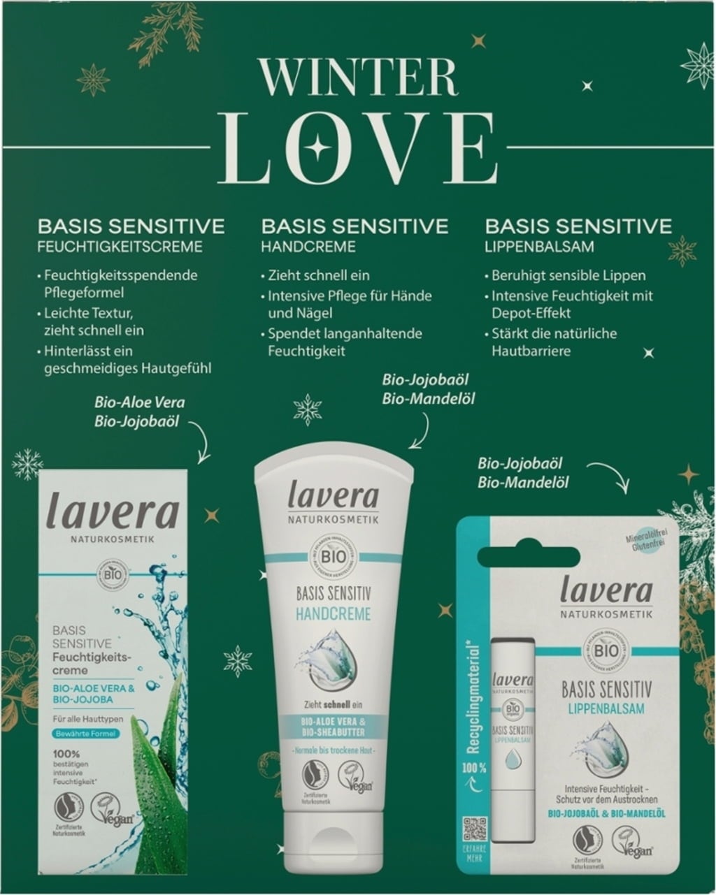 Dárková sada Winter Love nabízí pečující trio – hydratační krém, krém na ruce a balzám na rty. Poskytuje pokožce intenzivní péči a ochranu během chladného období. Díky slavnostnímu balení je navíc perfektním dárkem.