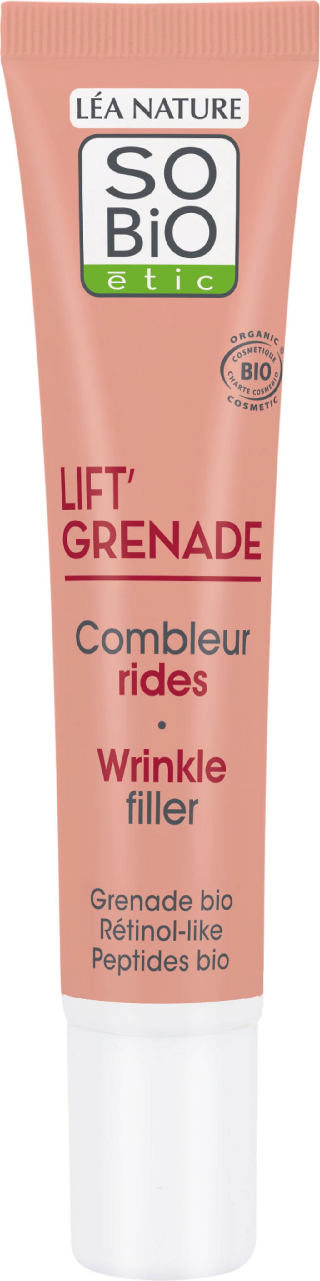 Vyplňovač vrásek z řady Lift’Grenade je profesionální krém, který kombinuje vyhlazující účinky s intenzivní péčí. Díky inovativní textuře s kombinací vyplňujícího a matujícího pudru pomáhá vyhlazovat vrásky, jemné linky i nerovnosti pleti. Účinné aktivní látky, jako je bio granátové jablko z Francie a bio peptidy, vytvářejí hýčkající anti-aging synergii.