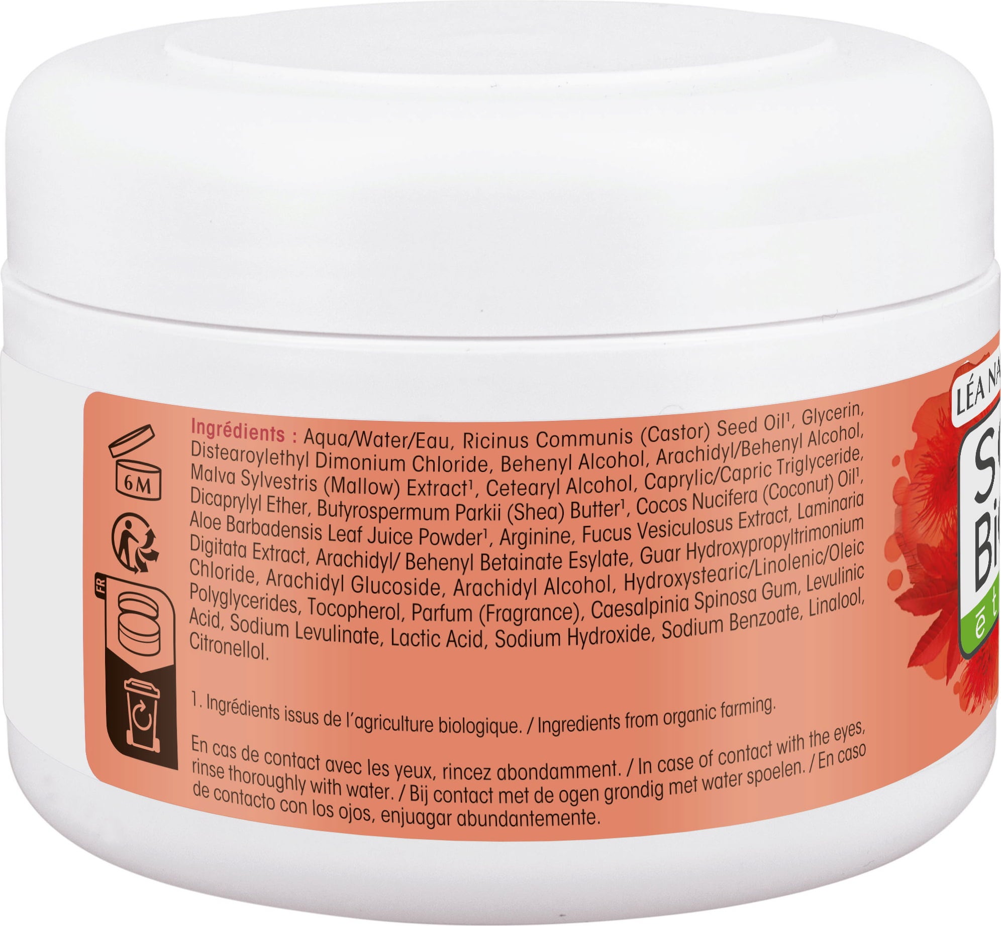 Aqua, Ricinus Communis Seed Oil[1], Glycerin, Distearoylethyl Dimonium Chlorid, Behenylalkohol, Arachidyl/Behenyl Alcohol, Malva Sylvestris Extract[1], Cetearylalcohol, Caprylic/Capric Triglyceride, Dicaprylyl Ether, Butyrospermum Parkii (Shea) Butter[1], Cocos Nucifera (Coconut) Oil[1], Aloe Barbadensis (Aloe Vera) Leaf Juice Powder[1], Arginin, Fucus Vesiculosus (Bladderwrack) Extract, Laminaria Digitata Extract, Arachidyl/Behenyl Betainate Esylate, Guar Hydroxypropyltrimonium Chloride, Caesalpinia Spinosa Gum, Arachidyl Glucoside, Arachidyl Alcohol, Hydroxystearic / Linolenic / Oleic Polyglycerides, Tocopherol (Vitamin E), Parfum, Levulinic Acid, Sodium Levulinate, Lactic Acid, Sodium Hydroxyde, Sodium Benzoate, Linalool, Citronellol