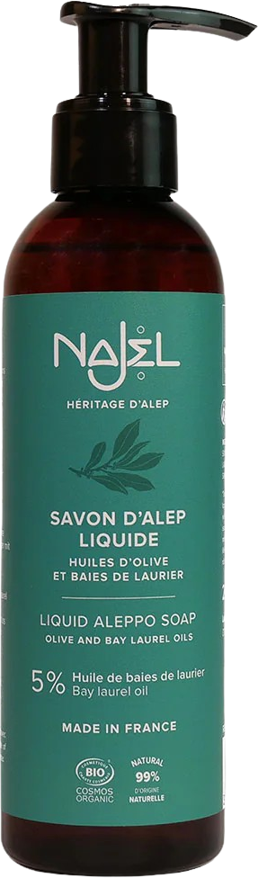 Objevte pravé mýdlo Aleppo v tekuté formě, které je vhodné i pro suchou, citlivou a podrážděnou pokožku. Jedná se o autentický výrobek, který je známý po celém světě. Společnost Najel jej vyrábí výhradně z bio olivového oleje a bio oleje z vavřínových bobulí, aby poskytla přírodní produkt vynikající kvality. Objevte řemeslné umění syrských mýdlařských mistrů!