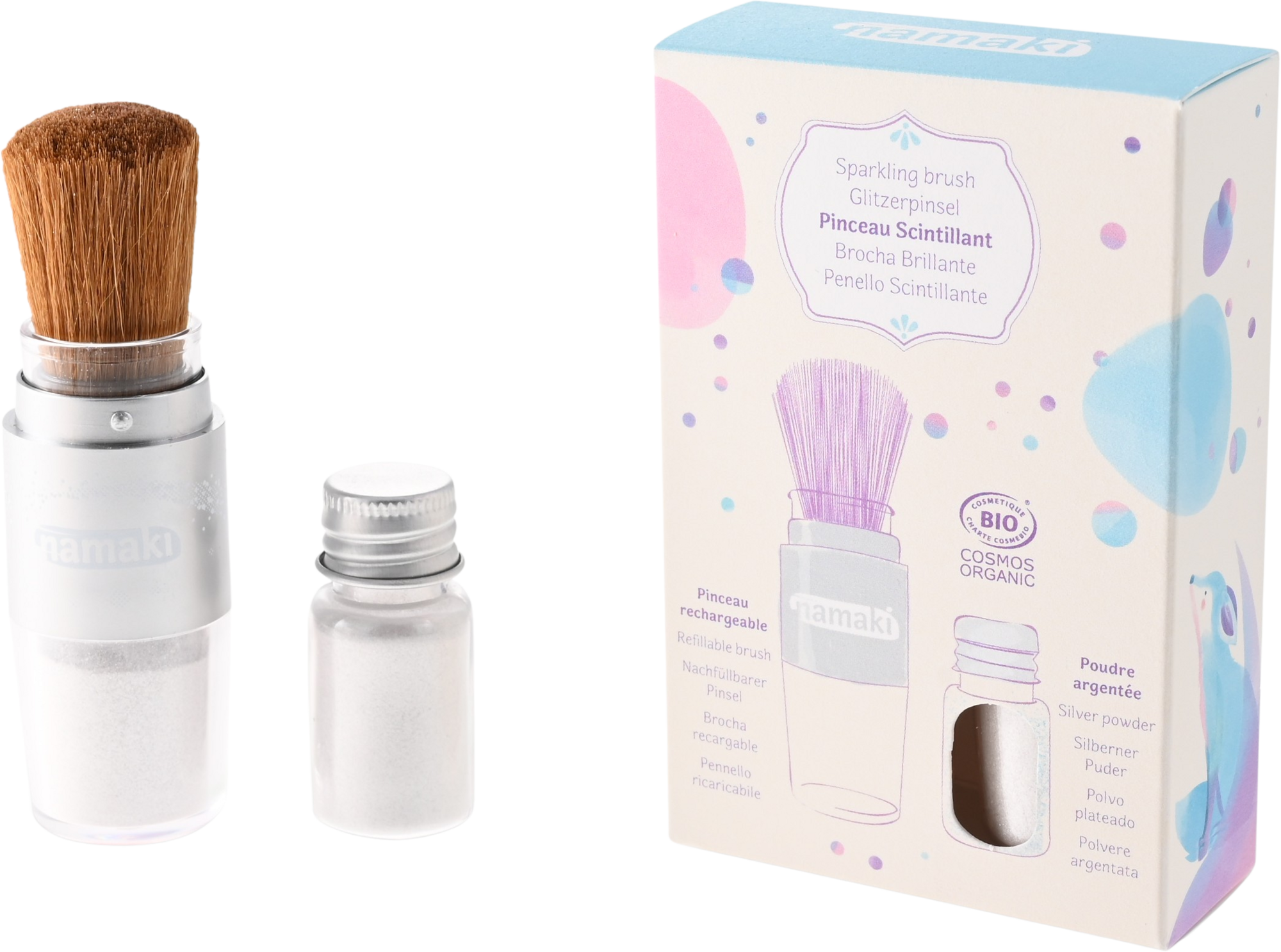 Sparkling Powder značky namaki je vyroben ze 100% přírodních a minerálních složek. Díky tomu je nejen mimořádně šetrný k pokožce, ale také šetrný k životnímu prostředí. Nanáší se obzvlášť snadno, pomocí Magic Brush, a lze jej vrstvit. Malé princezny a víly se mohou třpytit od hlavy až k patě!