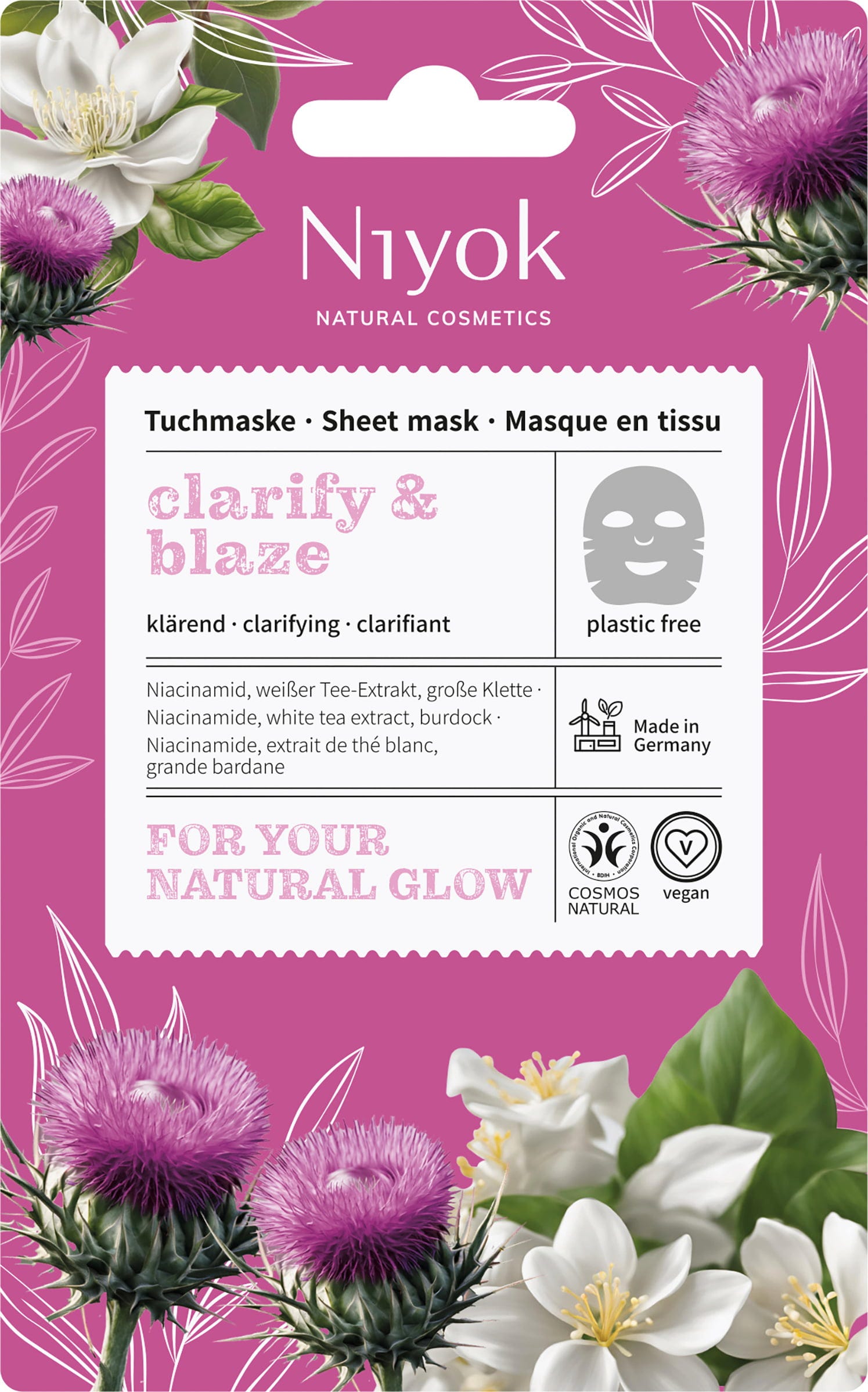 Složení této látkové masky nabízí díky niacinamidu (vitamín B3), extraktům z bílého čaje a lopuchu vyrovnávající a hloubkově čisticí účinky. Pleť je tak viditelně jemnější a nedokonalosti lze účinně udržet pod kontrolou. Velkým benefitem je také to, že masku lze po použití kompostovat, protože je zcela bez plastů.