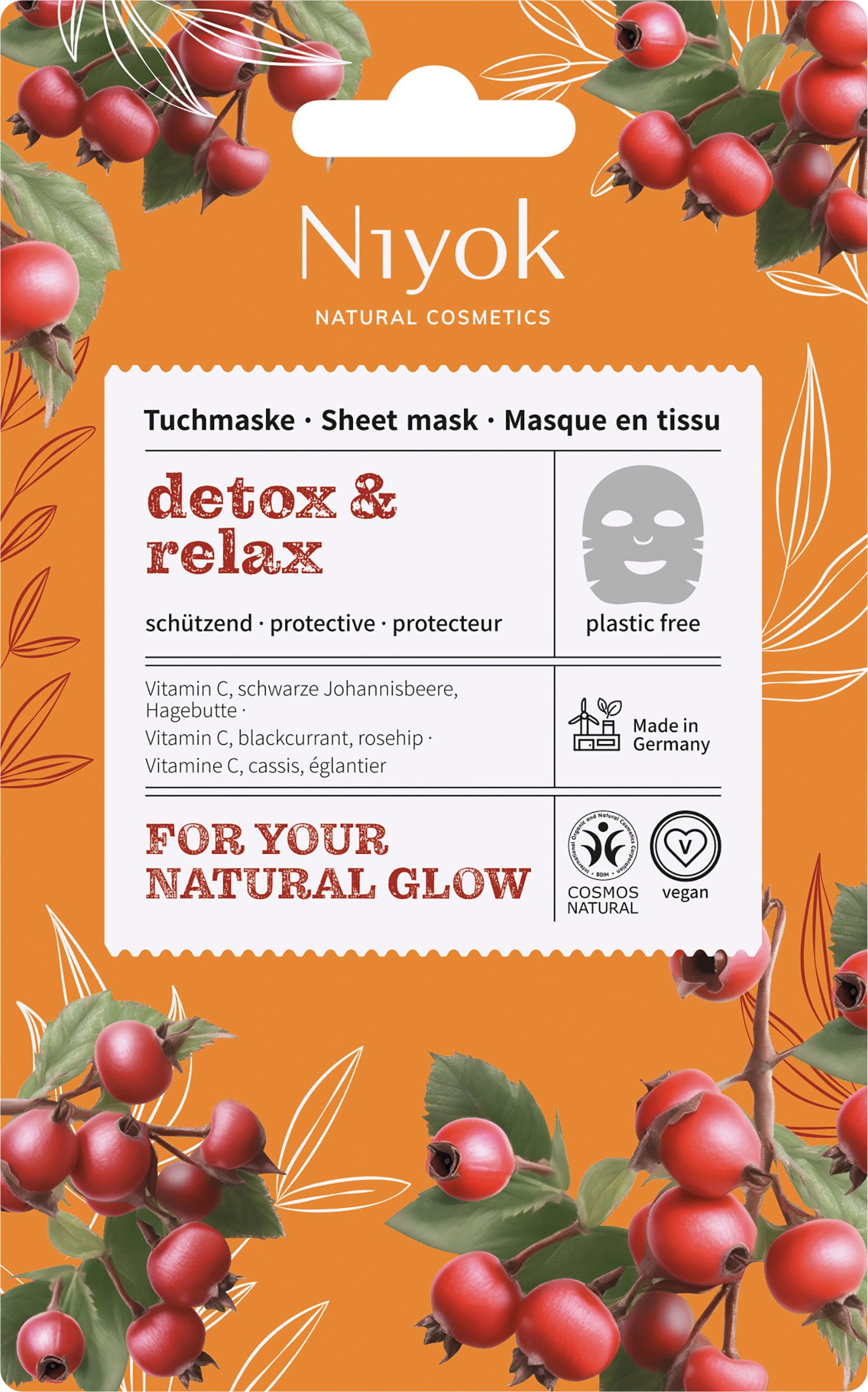 Tato látková maska podporuje pleť v ochraně před oxidačním stresem a negativními vlivy životního prostředí a zanechává ji pěstěnou a v rovnováze. Její složení obsahuje kromě vitaminu C také cenné oleje ze semínek černého rybízu a šípku, které pleť zásobují důležitými živinami a intenzivní hydratací. Samotná maska je vyrobena z rostlinných vláken a je kompostovatelná, pro veganskou péči bez plastů.