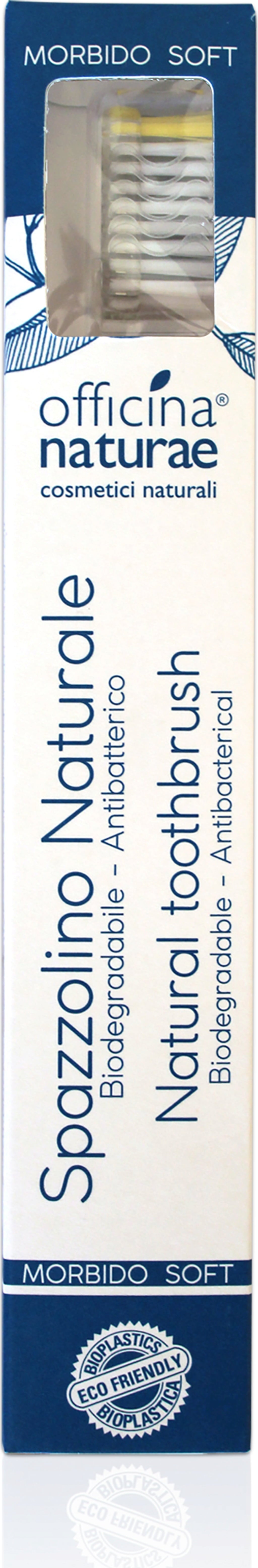 Udržitelný zubní kartáček značky Officina Naturae optimálně čistí zuby při každodenní ústní hygieně. Tělo kartáčku je vyrobeno z organického plastu - z dřevní hmoty - a vnější bílé štětiny jsou vyrobeny z ricinového oleje. Jsou obzvláště měkké, takže nenarušují zubní sklovinu a jsou šetrné i k dásním. Středové štětiny jsou vyrobeny z nylonu a inovativním postupem jsou napuštěny částicemi stříbra. Díky nim se zubní kartáček po celou dobu své životnosti samočistí a je mimořádně hygienický.