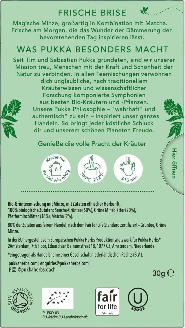 Tento unikátní zelený čaj byl sestaven bylinnými experty a nutričními specialisty společnosti PUKKA, kteří kombinují nejnovější vědecké poznatky s tradičními znalostmi o bylinkách. Výsledkem je synergická kombinace bio máty, máty peprné, zeleného čaje sencha a matcha, která vytváří vyvážený šálek s chladivými aromaty a jemnými bohatými tóny. Pro lahodný šálek plný osvěžující chuti.