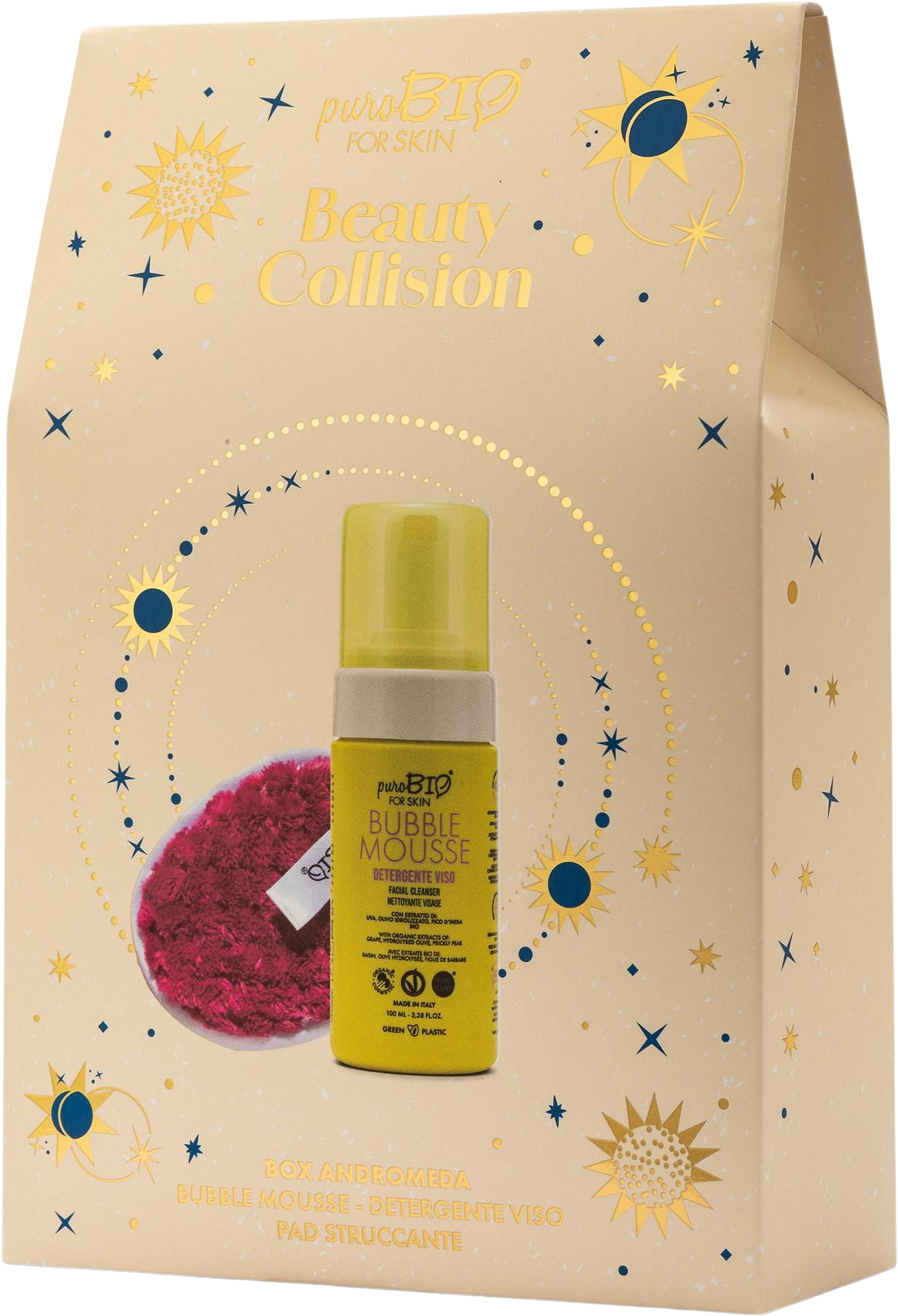Sada „Andromeda“ obsahuje mimořádně jemnou čisticí pěnu na obličej, která je vhodná pro všechny typy pleti a šetrně ji zbavuje nečistot. Aby bylo odlíčení ještě snazší, najdete v sadě také pratelný a znovupoužitelný odličovací tamponek.