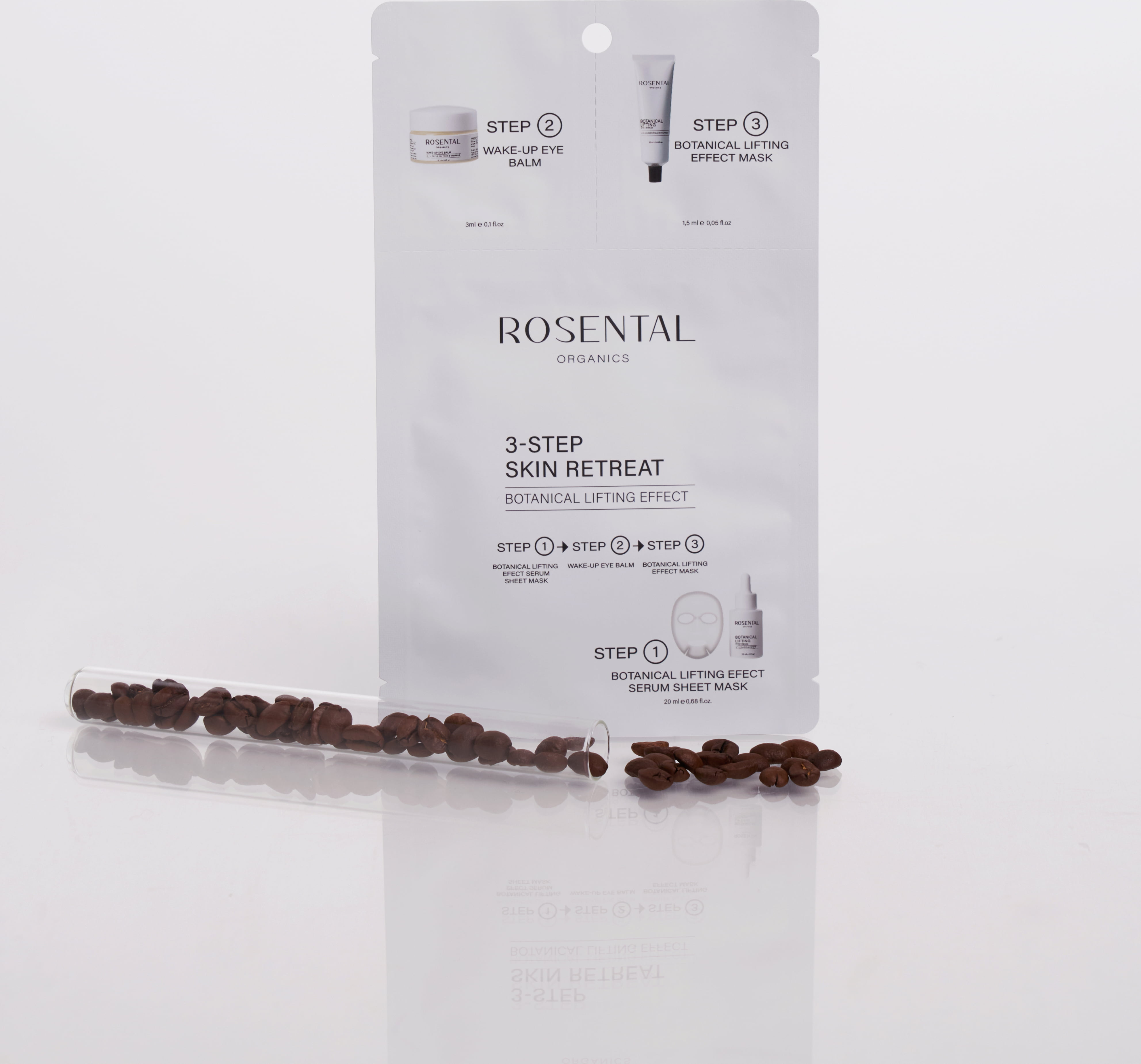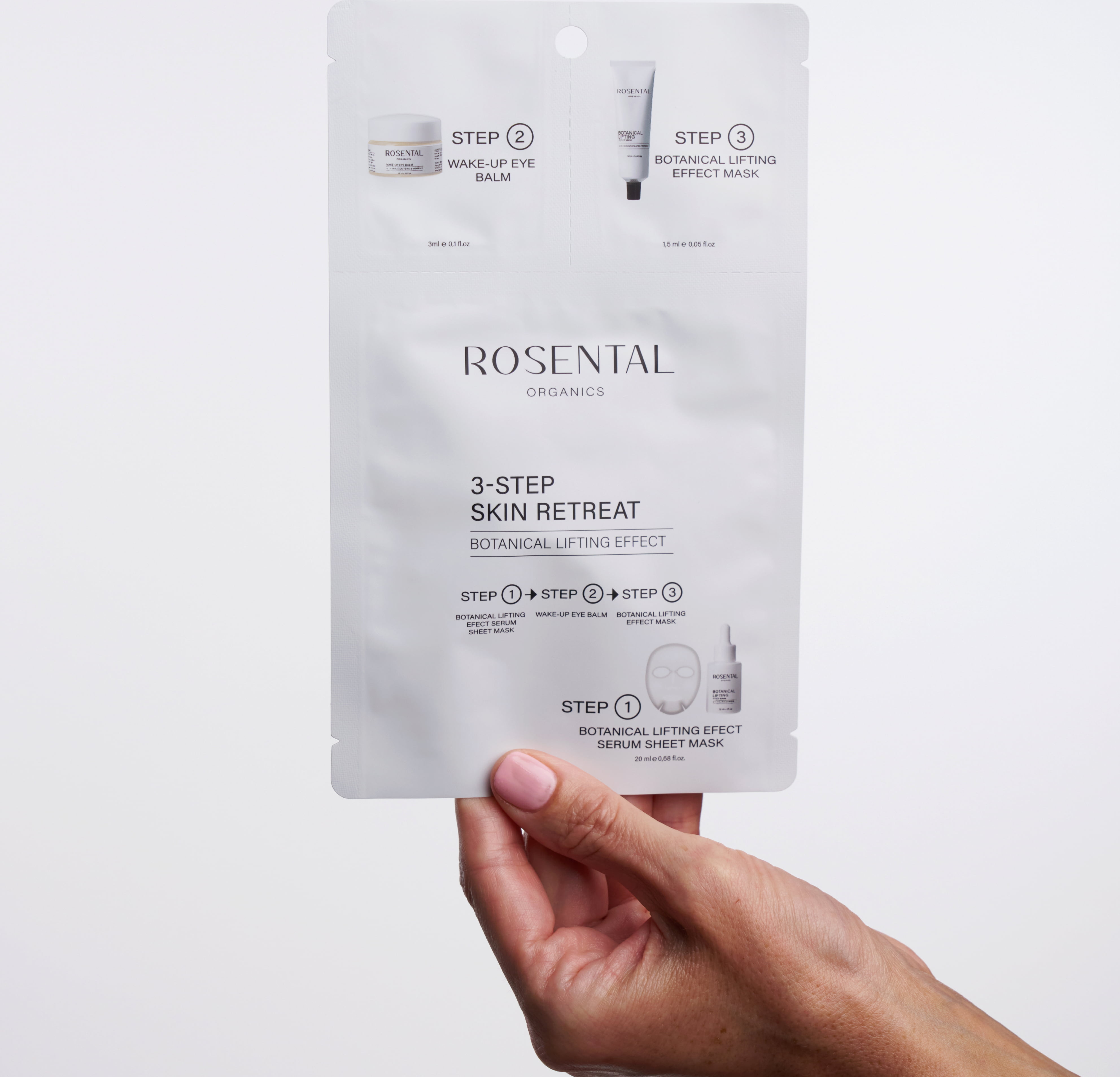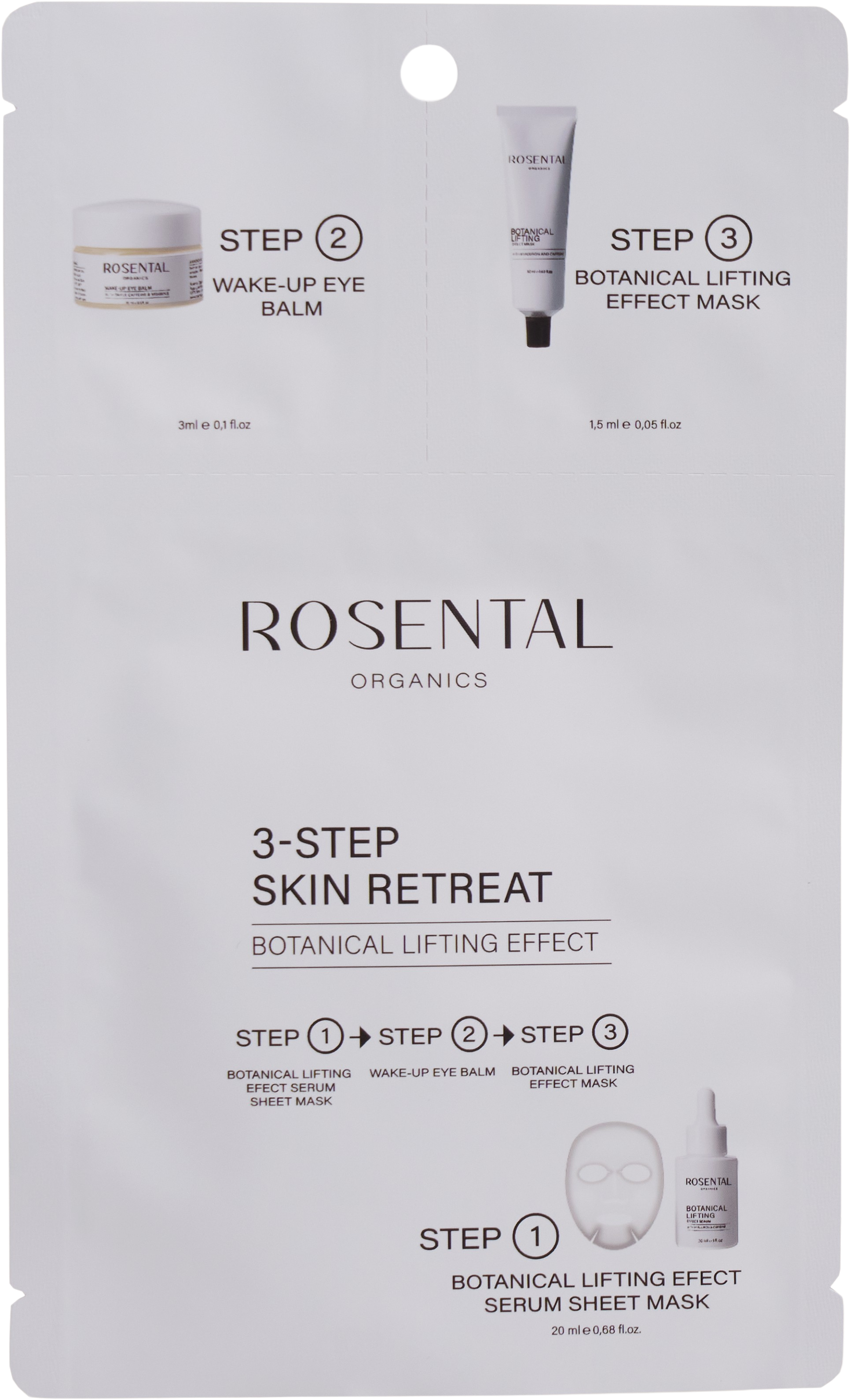 Tato tříkroková intenzivní péče představuje exkluzivní jednorázové použití s maximálním účinkem. Jako intenzivní beauty rituál je ideální na cesty nebo pro seznámení s nejprodávanějšími produkty značky Rosental. Sáček obsahuje tři přípravky, které v dokonalé synergii vyhlazují pleť, rozjasňují ji a přinášejí liftingový efekt.