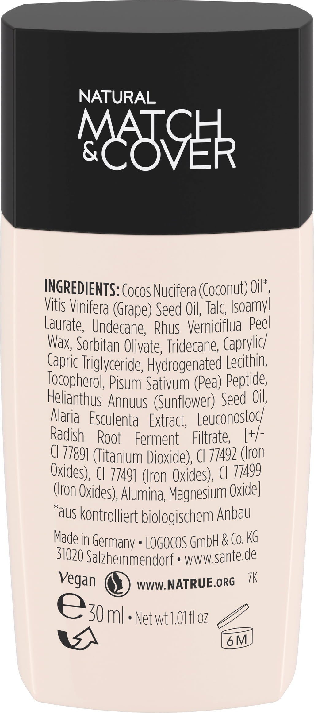 Cocos Nucifera (Coconut) Oil[1], Vitis Vinifera Seed Oil, Talc, Isoamyl Laurate, Undecane, Rhus Verniciflua Peel Wax, Sorbitan Olivate, Tridecane, Capric/Caprylic Triglyceride, Hydrogenated Lecithin, Tocopherol (Vitamin E), Pisum Sativum Peptide, Helianthus Annuus Seed Oil, Alaria Esculenta Extract, Leuconostoc/Radish Root Ferment Filtrate, Může obsahovat (+/-)[ CI 77891 (Titanium Dioxid), CI 77492 (Iron Oxide), CI 77492 (Iron Oxide), CI 77492 (Iron Oxide), Alumina, Magnesium Oxide]