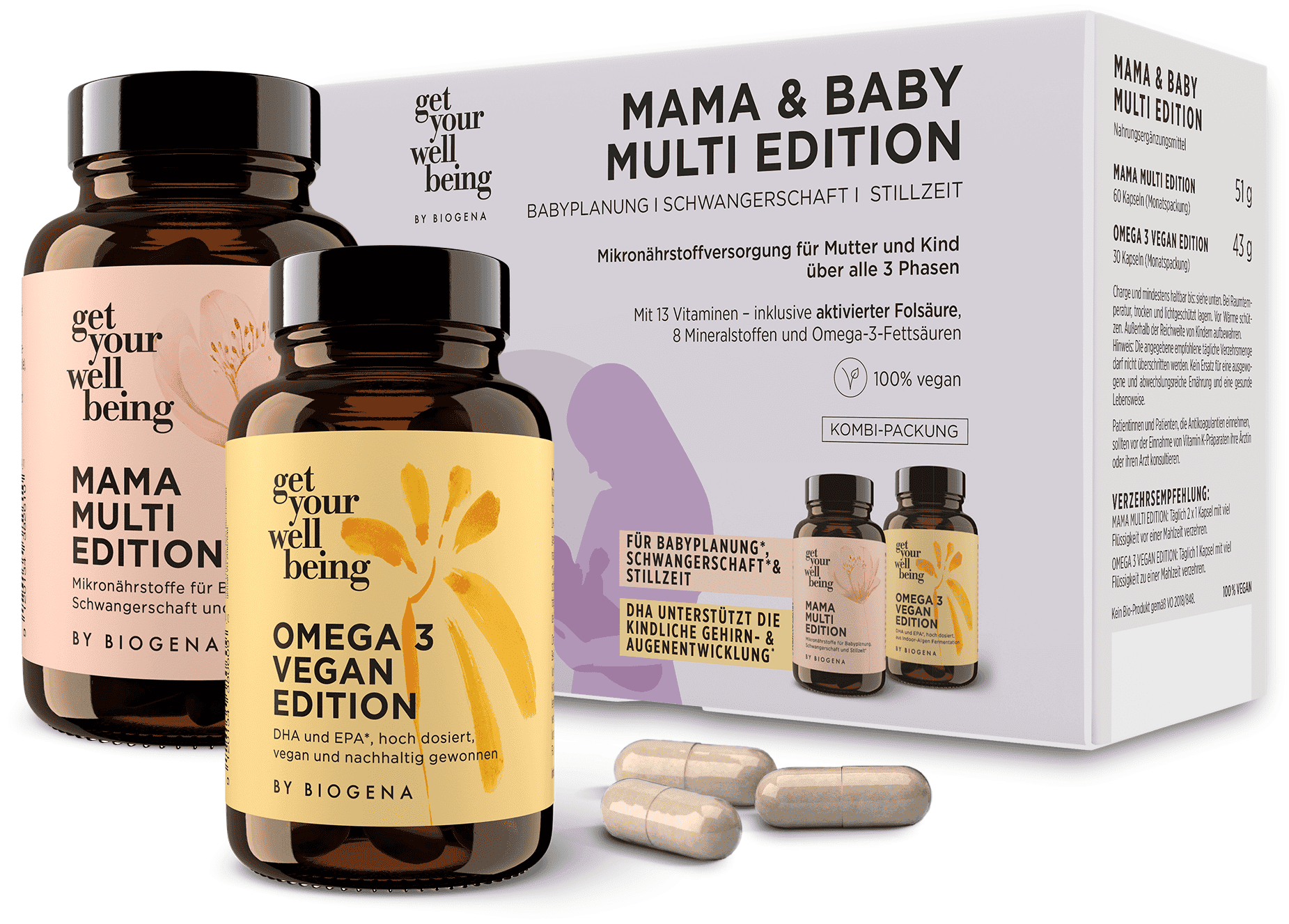 Tento balíček spojuje pečlivě vybrané multivitamíny s čistou omega‑3 z udržitelně získaného řasového oleje. Nabízí vyváženou kombinaci důležitých vitamínů, minerálních látek a cenných mastných kyselin – přizpůsobenou specifickým výživovým potřebám v citlivých životních obdobích. Všechny produkty jsou 100% veganské, bez barviv, neobsahují lepek ani laktózu a jsou bez konzervačních látek v souladu s platnými předpisy. Balíček není v bio kvalitě.
