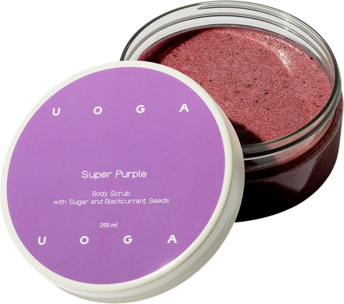Body Scrub "Super Purple" značky UOGA UOGA s máslovou konzistencí exfoliuje a vyživuje pokožku. Částečky cukru a semínka černého rybízu jemně odstraňují odumřelé kožní buňky, zatímco bambucké máslo a kokosový a sezamový olej pokožku hydratují a vyživují. Peeling je tak bohatý, že po něm nebudete potřebovat žádný krém.