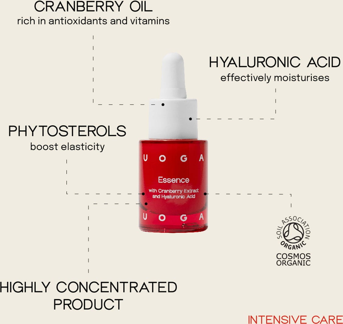 Essence je součástí řady intenzivní péče uoga uoga a poskytuje hydrataci, pokud máte pocit, že Vaše velmi suchá, unavená pleť, která může mít i suché linky, potřebuje kromě každodenního pleťového krému dodatečnou hydrataci. Tento produkt podporuje účinek ostatních kosmetických přípravků kyselinou hyaluronovou a fytosteroly.