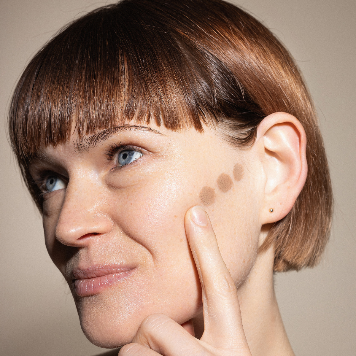 - krémový přípravek naneste prsty nebo štětcem na místa v obličeji, kterým chcete dodat hloubku - například pod lícní kosti, na vnější kontury obličeje nebo podél čelistí.