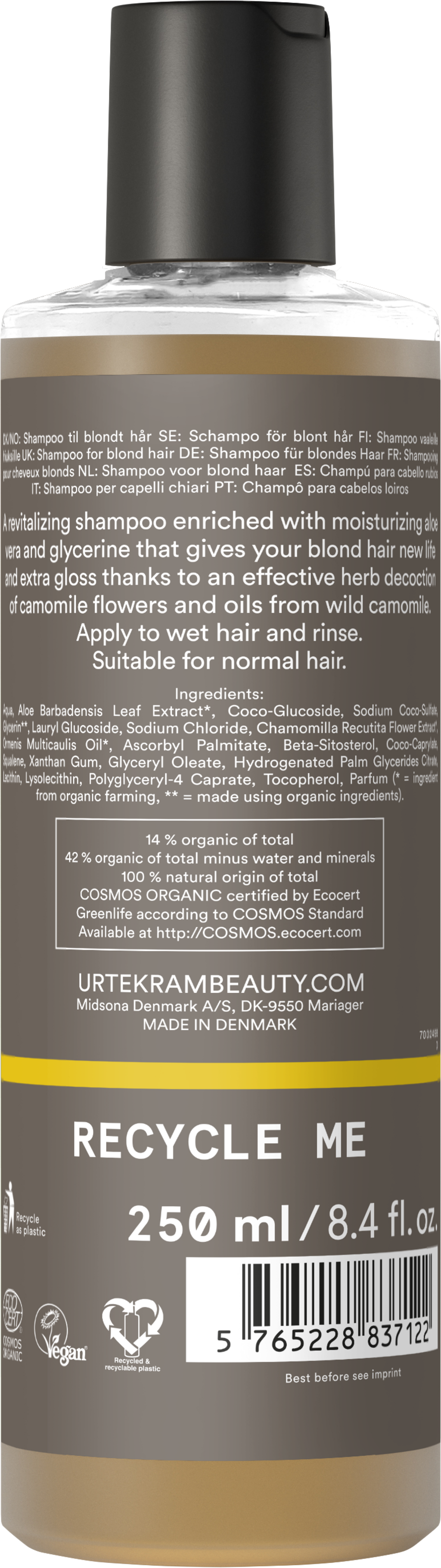 Šampon s heřmánkem představuje speciální čistící přípravek pro blond vlasy, který jim díky speciální bylinné směsi výtažků z heřmánkových květů a organického oleje z marockého heřmánku dodává novou vitalitu a lesk. Zároveň jsou vlasy během mytí hydratovány aloe vera a glycerinem.
