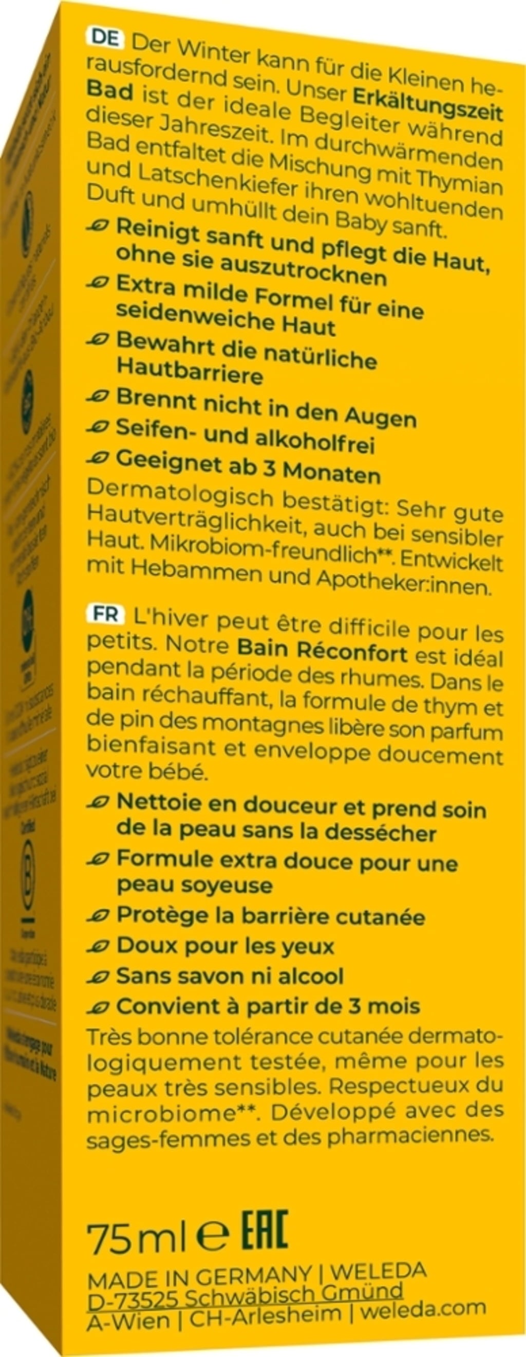 Chladné období může být náročné i pro ty nejmenší. Právě pro tento účel byla vyvinuta baby "čas nachlazení" přísada do koupele s bio měsíčkem a tymiánem. Je ideálním společníkem na zimu a nabízí hřejivý zážitek z koupele s měsíčkem lékařským, tymiánem a borovicí. Vůně obklopuje smysly, zatímco obzvláště jemné složení bez mýdla pečuje o pokožku a neštípe v očích.