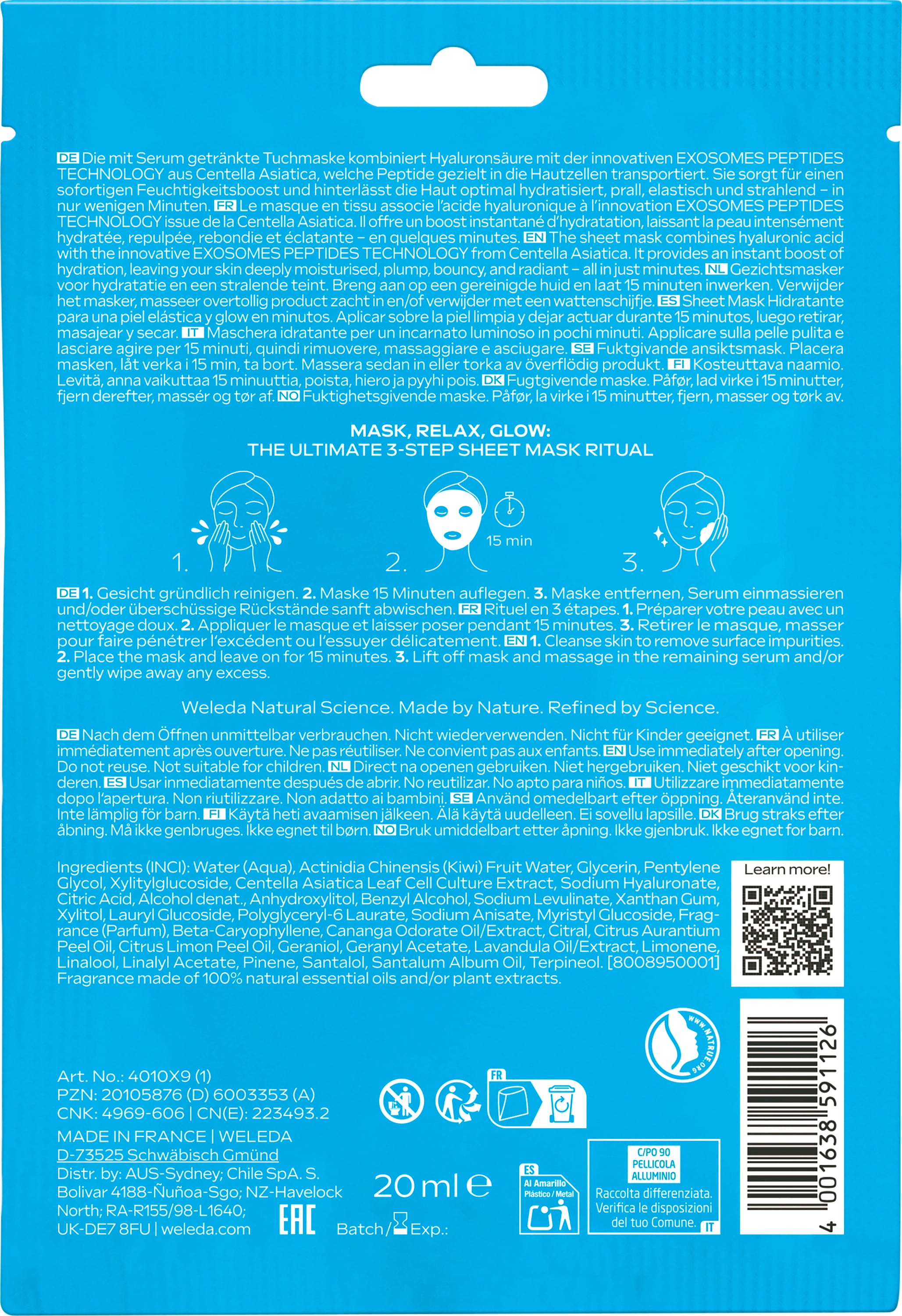 Inovativní EXOSOME Peptides Technology na bázi Centella Asiatica je v této masce kombinována s kyselinou hyaluronovou. Díky tomu jsou peptidy cíleně transportovány do kožních buněk a pleť je zároveň intenzivně hydratována. Pro optimálně hydratovaný, vyplněný, pružný a zářivý vzhled pleti.